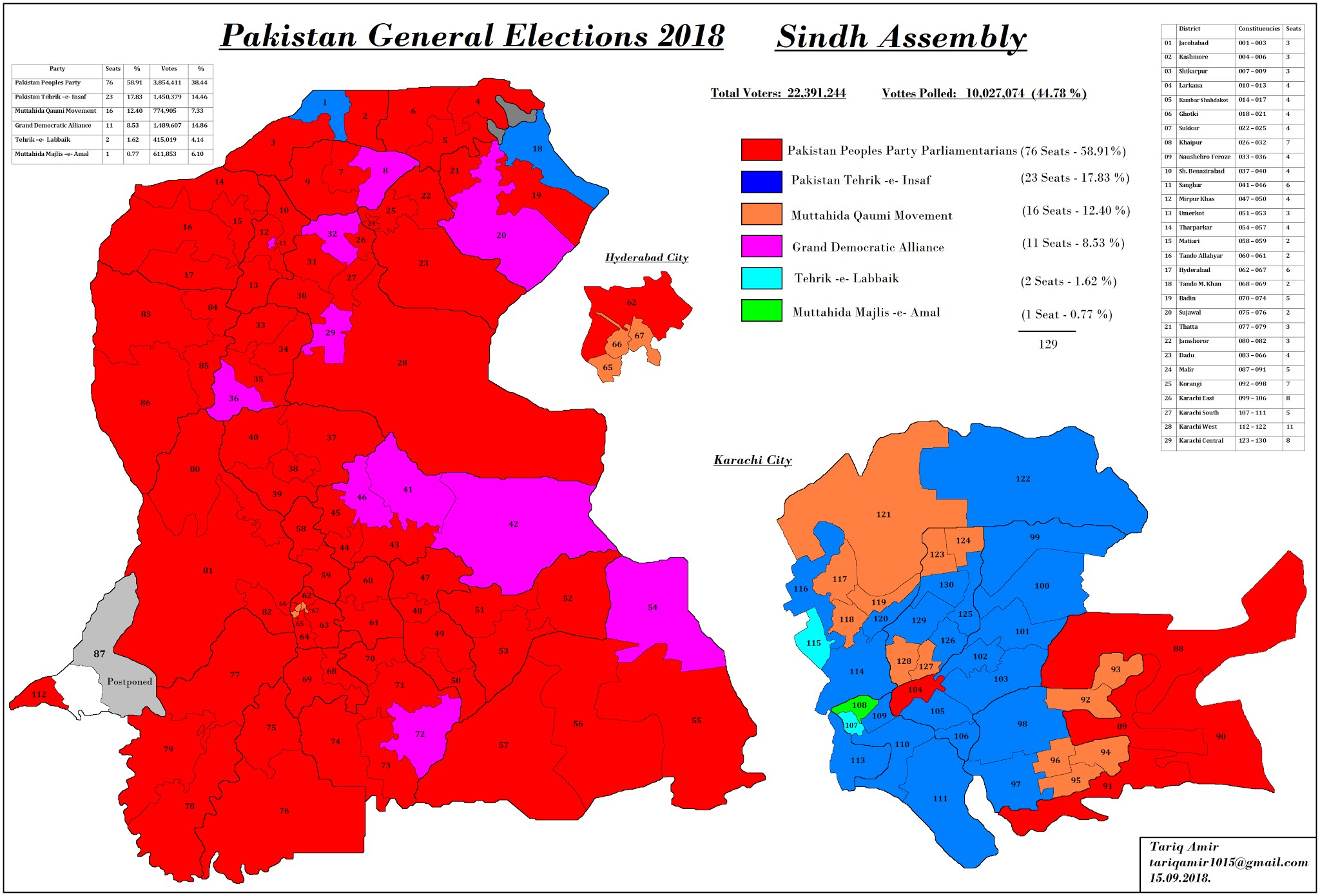 This is my third post about the elections held in Pakistan on 25 July 2018. In this post, you can see the results and the related maps. The Sindh Assembly has 130 seats, but elections were held in 129 constituencies.
