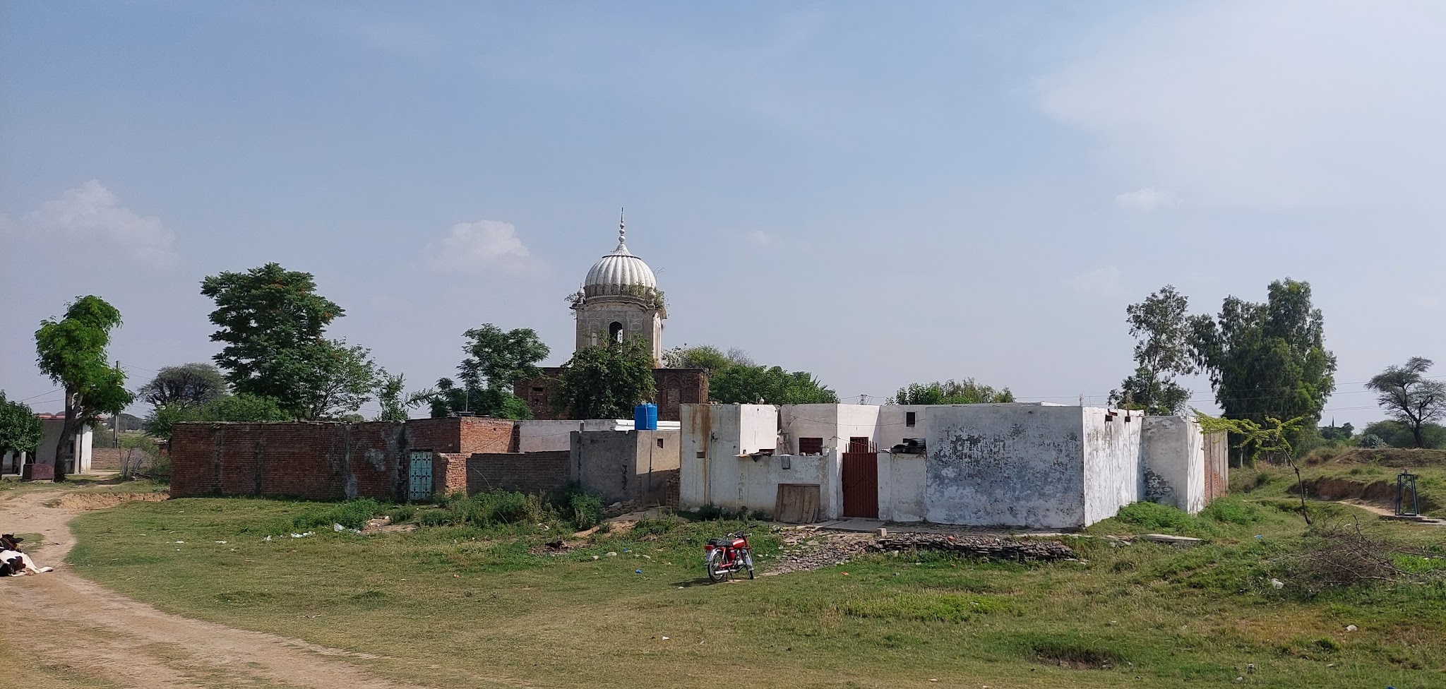 This gurdwara is situated at 33°24’20.11″N, 73°25’59.96″E. It lies on low ground and is surrounded by a few houses, so only the top of the building is visible from the main road, about 350 meters away. I visited the gurdwara on 30 April 2023. The site is located amidst beautiful plants and trees, with a small brook flowing nearby.