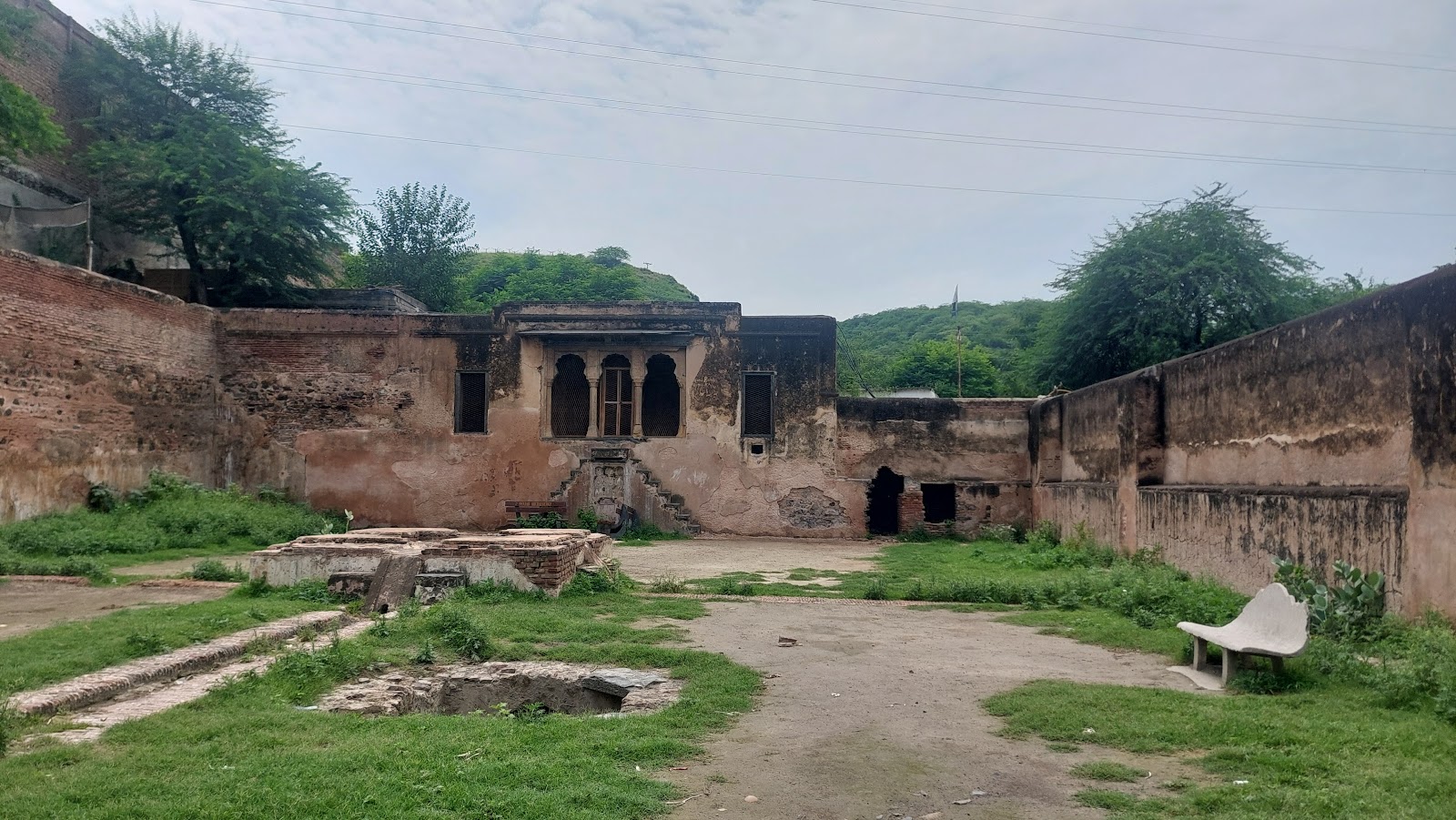 The baradari is located at: 32°31’28.04″N, 73°58’31.43″E. It is square in shape, with each side approximately 25 metres in length. It has two floors, and each floor features two sets of arches, one on the outside and another on the inside. Simply speaking, an inner square is surrounded by a corridor, a very common architectural style of that era. I have seen the same pattern in many gurdwaras built even in much later times. The structure was built with the small bricks widely used during the Sikh period.