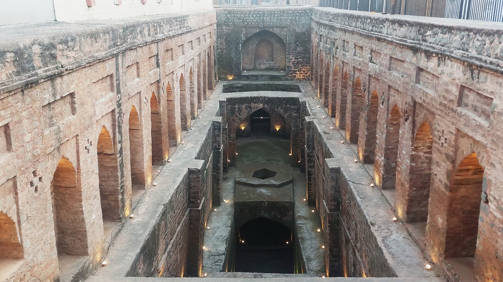 At the starting side of the baoli is a large square room with arched passageways on all four sides. The room is solidly built in the traditional Mughal style and serves as the entrance to the baoli. From this side, stairs lead down to the water table. The stairs are broad and easy to climb.