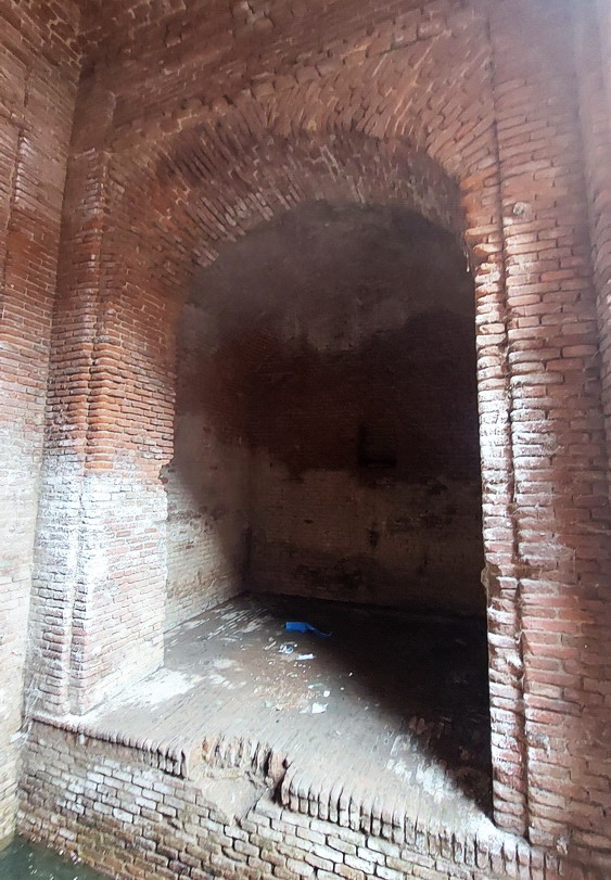 Near the water table, there are two rooms on either side of the stairs. These were probably used for resting during summer or perhaps by caretakers to monitor and regulate visitors. The entire structure is built of small bricks, as was the custom during Mughal times.