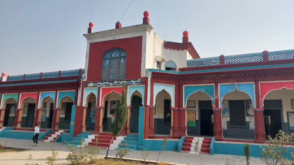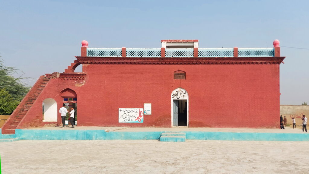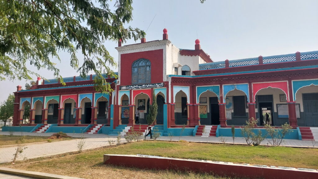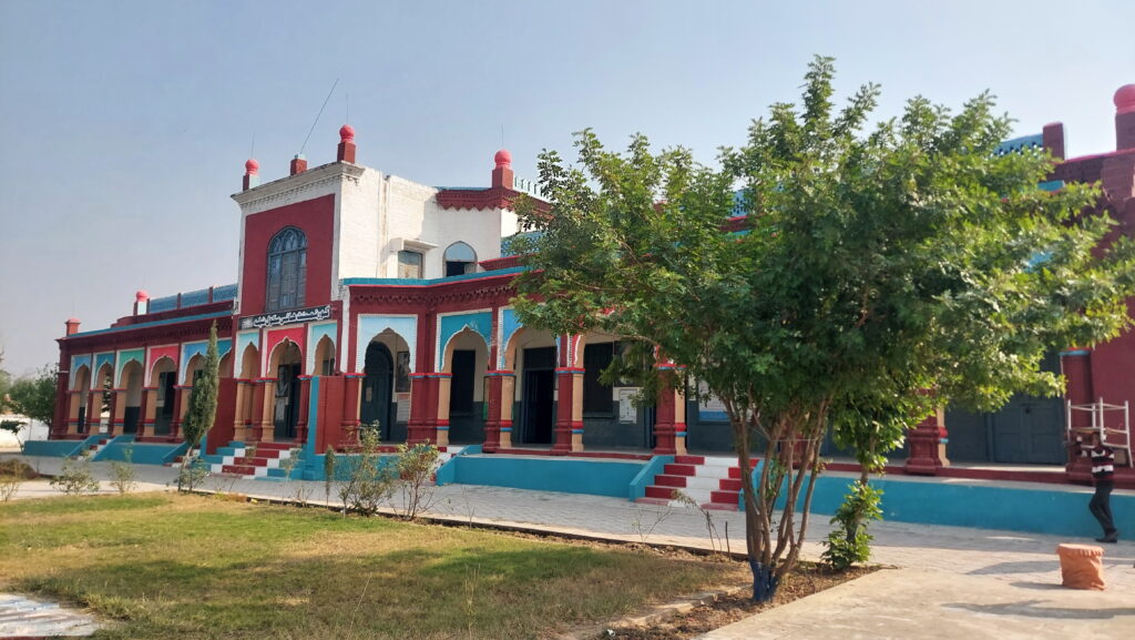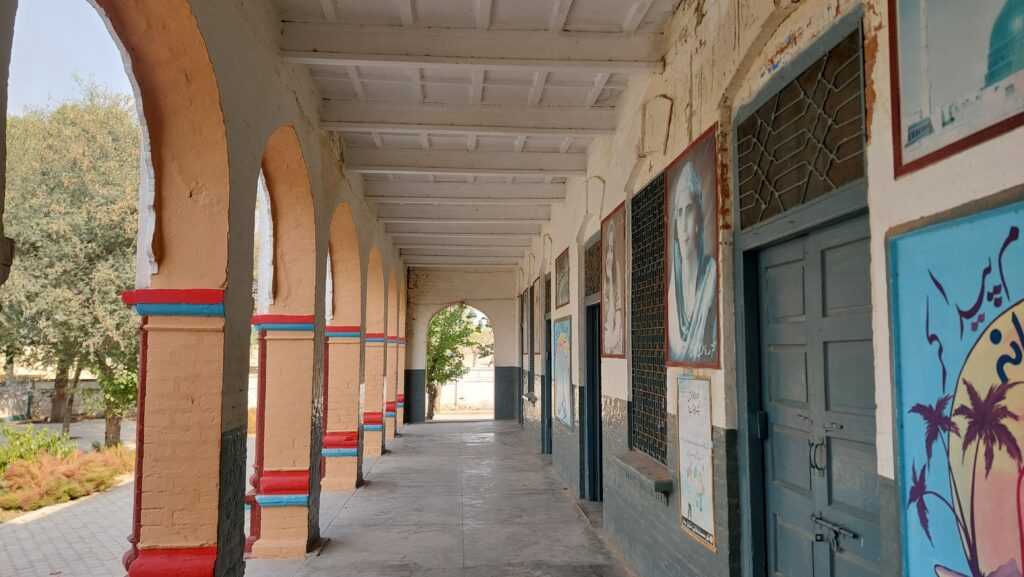 The school building reflects a graceful blend of traditional Mughal architectural elements with colonial-era institutional design. Constructed in solid masonry, It follows a symmetrical layout with a long arched veranda running along its front, providing shade and ventilation. The cusped arches, resting on sturdy pillars, give the façade a dignified appearance. A slightly raised central portionadds prominence to the structure. The building is painted in a striking combination of deep red, white, and turquoise blue, with red highlighting the arches and pillars, white used for cornices and wall surfaces, and blue adding contrast to panels and doors. Built in the third decade of the twentieth century, the building not only served an educational purpose but also stands as a fine example of heritage architecture in the Potohar region.