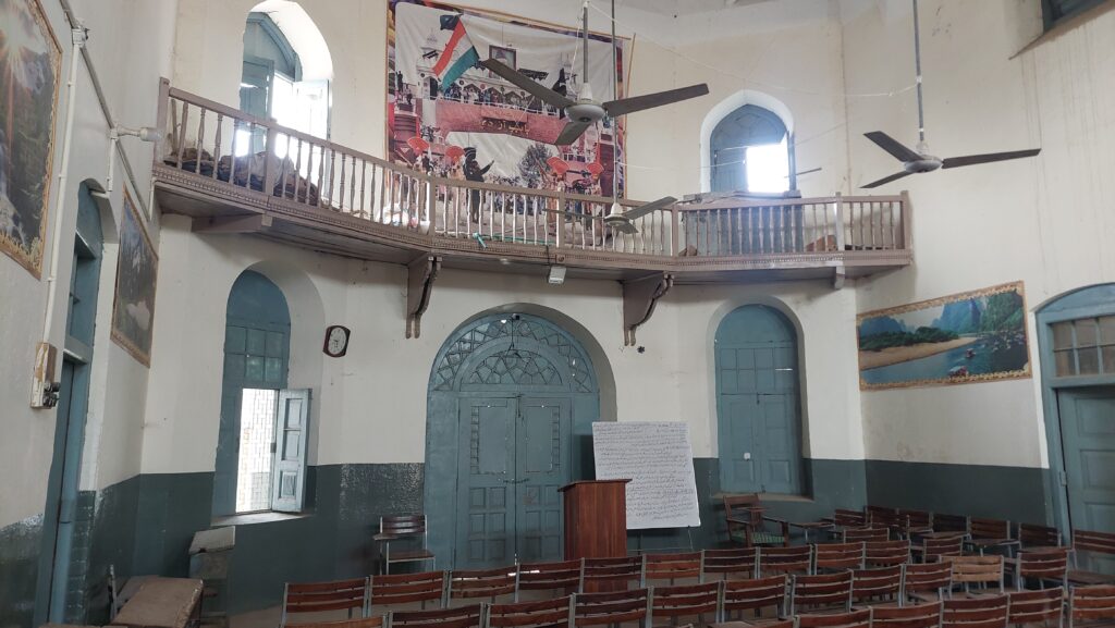 There is a big spacious and airy hall in the middle and two wings on both sides, with four rooms in two rows in the each wing. The rooms are quite large, airy and naturally well lit, with many doors, windows and ventilators, providing ample fresh air and light. The main hall too has all these qualities, which make it an excellent place for functions and large gatherings. An amazing facility for a school of a village, and that’s too one hundred years ago.