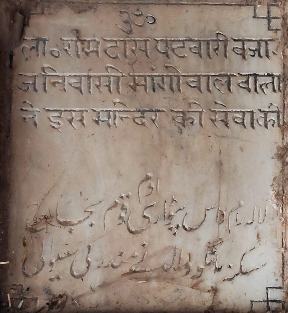 Plaques on old historic buildings are of special interest to me. They provide the most authentic information about the history and the builders, which is otherwise very difficult to find. In this temple, I found almost 12 plaques, which provide information about the builders and donors. However, they lack one very important detail—that is, the date. No plaque gives any date; thus, we cannot determine the time of its construction. Three of these plaques are written in Urdu, two in Hindi, while seven are in both Urdu and Hindi.